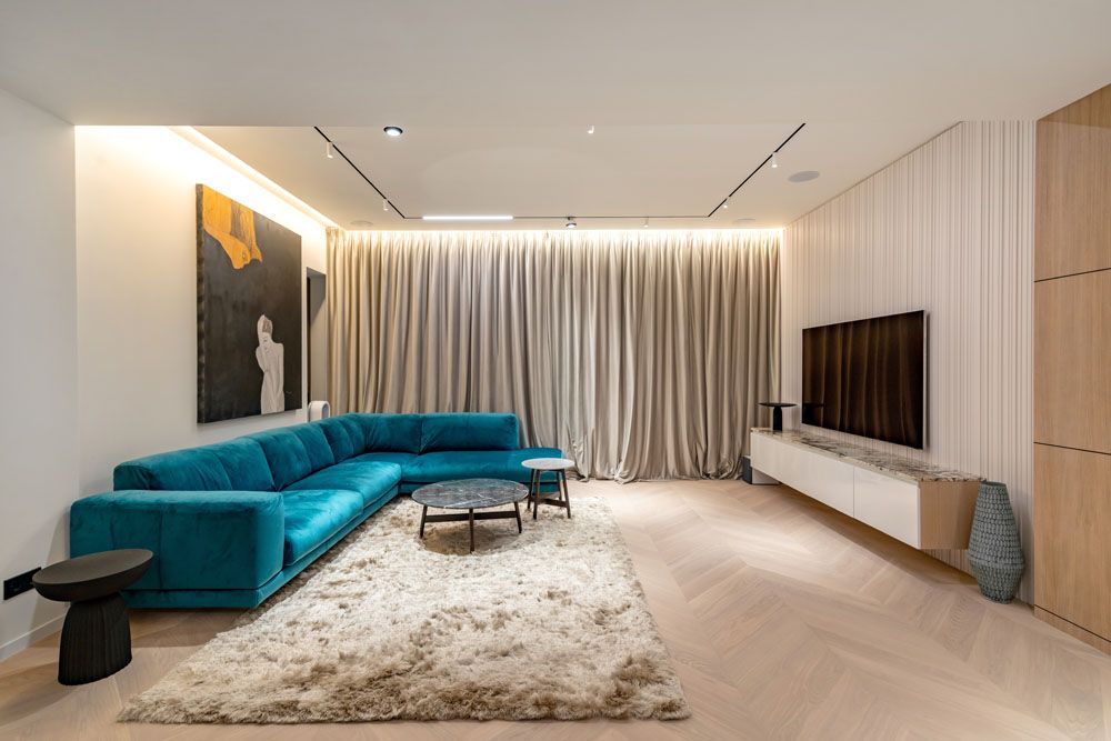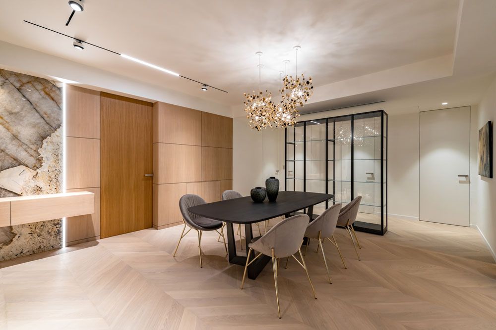 The apartment measures 252 sqm, a large area, developed functionally with a sense of coziness, luxury and simplicity, creating the impression of a spacious and airy home, under a minimalistic approach. The interior color scheme is neutral, with small accents of color, linked with a range of minimalistic details.